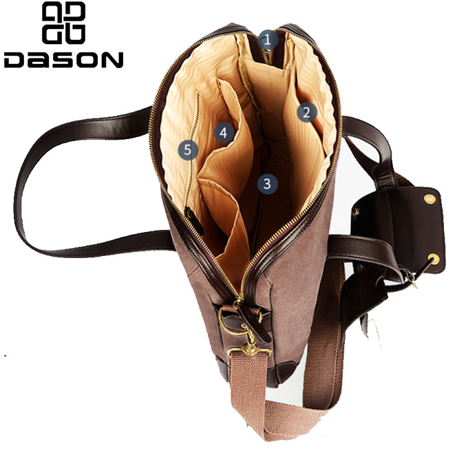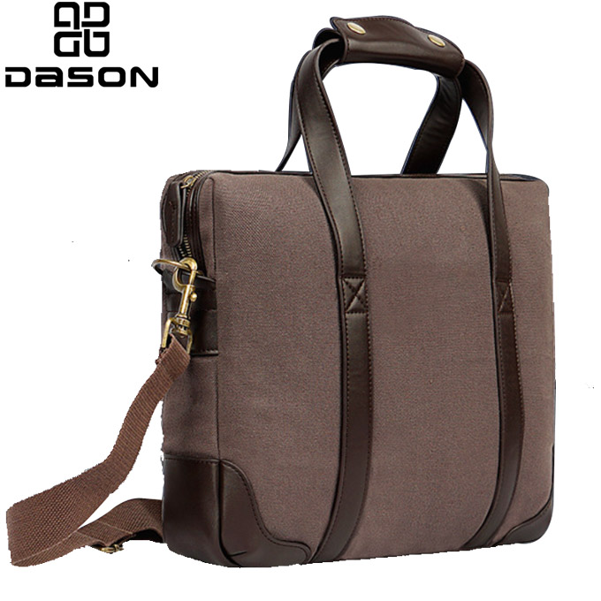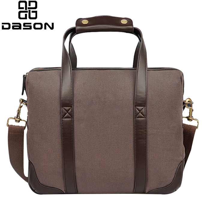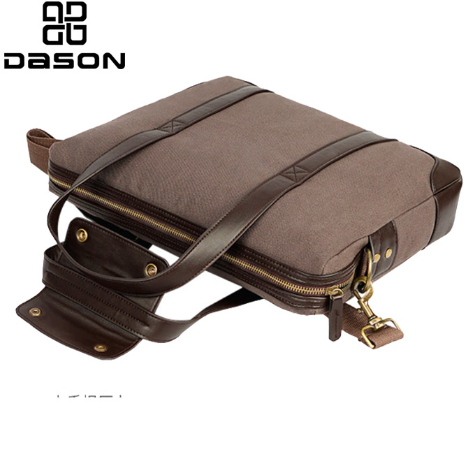 Canvas-Laptop-Kuriertasche im Design mit klassischem Ledergriff und Nylon-Schultergurt mit bronzierten Haken und Schnallen